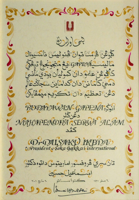 In March 2006, the Federation of Writers Association Malaysia (GAPENA) bestowed its Highest Cultural Award to the SGI leader.