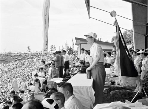 The second president of the Soka Gakkai, Josei Toda (1900–58) made a key declaration condemning nuclear weapons as an absolute evil which threaten humanity’s right to live, and calling for their prohibition in front of 50,000 Soka Gakkai youth gathered at Mitsuzawa Stadium in Yokohama on September 8, 1957. It was the height of the Cold War, when nuclear weapons capable of destroying all life on Earth cast a dark shadow over the destiny of all humankind.