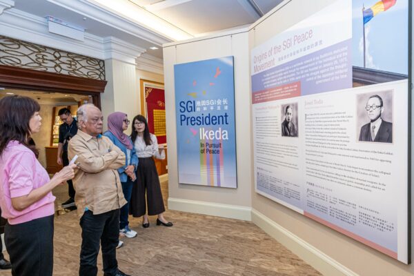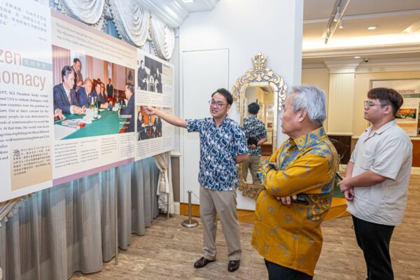 Dato’ Sri Khairudin Samad carefully reading the exhibition panels and listening to explanations on the Soka Gakkai’s global peace movement.