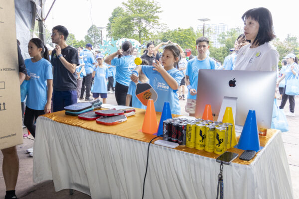 YB Sandrea Ng (on stage, centre) flagged off the event with other guests.Peace lovers moving step by step for realising peace in their communities, transcending background and ages.An ethnic Indian participant enjoying the run.Participants enjoying games played with pickleball paddles.A decorative backdrop of waves using recycled bottle caps shows the organiser’s creativity and efforts in carrying out sustainability.