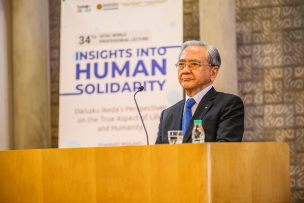 Speaking to 250 participants in person and 475 online, President Harada discussed how President Ikeda exerted himself in building global human solidarity based on the Buddhist perspective on the eternity of life, which expounds that birth and death are aspects of the eternal self, and that the Buddha nature exists in all living beings; therefore, all are worthy of supreme respect. This understanding has driven his peacebuilding endeavours, which include dialogues with leaders of China and the Soviet Union at a tense period between the two countries.
