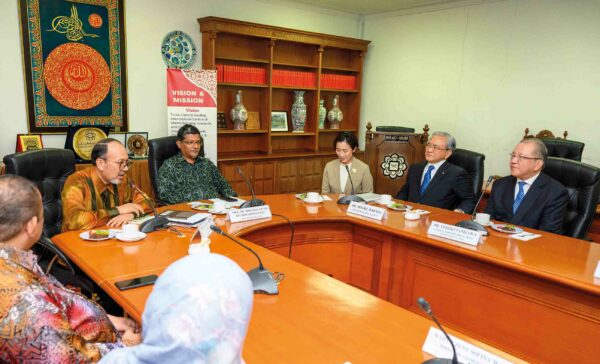A discussion session prior to the lecture. (From left) Prof Dr Hazizan Md Noon and Prof Dr Mohd Aslam Mohd Haneef; (from right) Yoshiki Tanigawa and Minoru Harada.The lecture attracts diplomats, scholars, university students and SGM members to attend the event, which was also broadcast live online.Second Daisaku Ikeda Memorial Lecture book, published by ISTAC-IIUM Publications