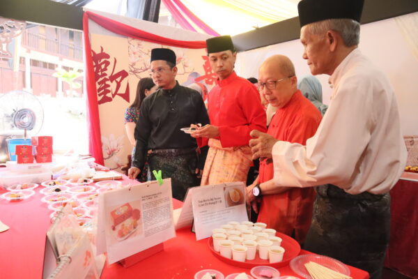 A couple dressed in traditional attire offering a ceremonial toast to Negeri Sembilan Menteri Besar YAB Dato’ Seri Utama Aminuddin Harun and his spouse.Visitors savouring delicacies while experiencing the essence of Chinese culinary culture.