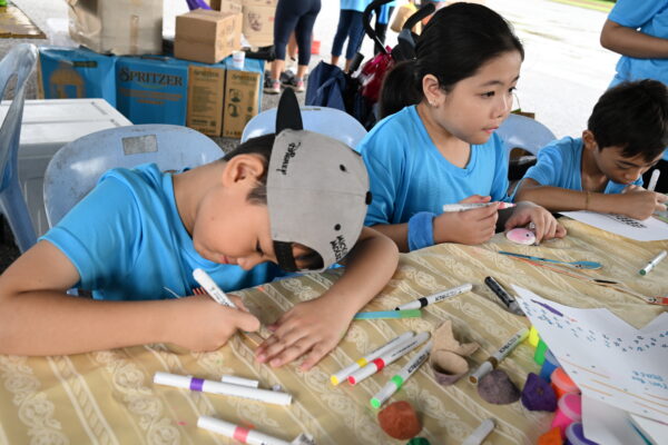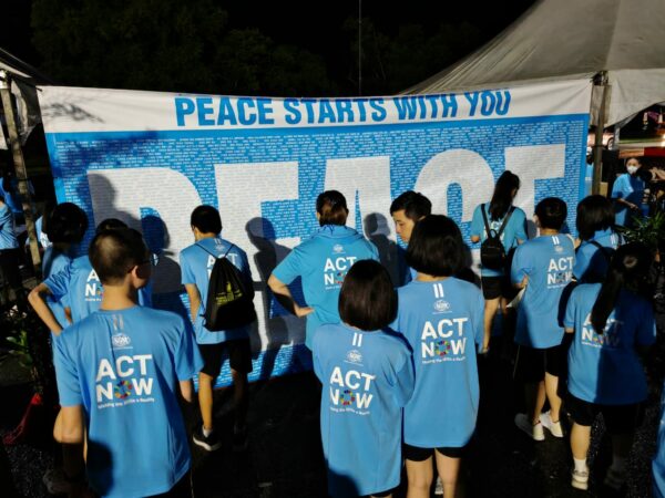Participants looking at a banner bearing the words “Peace Starts with You,” which contains all their names.Guest of honour YTM Tunku Puteri Intan Safinaz standing in front the “Peace Starts with You” banner which contains the names of all runners.Even a drizzle could not stop peace lovers from completing the entire journey to promote peace.Young peace lovers happily using stones, seashells and eco-friendly materials to create their own paintings.