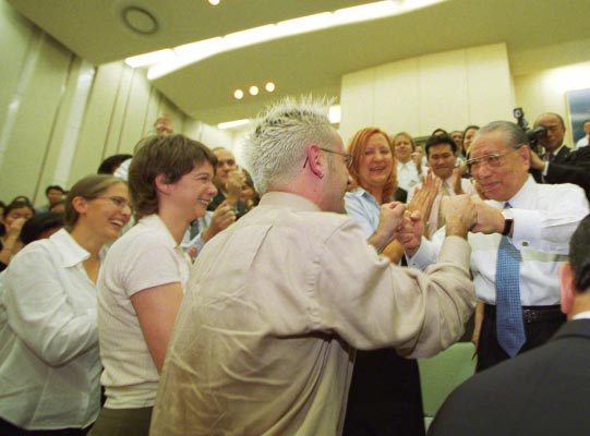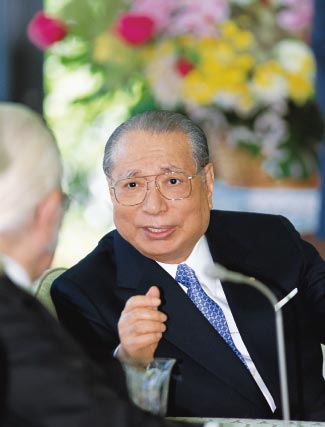 Encouraging Soka Gakkai youth members from around the world, Tokyo, 2002 [© Seikyo Shimbun]