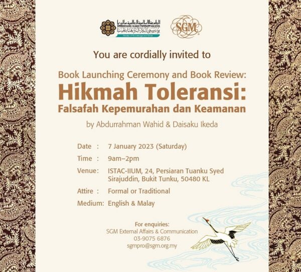 To celebrate the publication of their dialogue in Malay – Hikmah Toleransi: Falsafah Kepemurahan dan Keamanan, the International Institute of Islamic Thought and Civilisation of International Islamic University Malaysia (ISTAC-IIUM) together with Soka Gakkai Malaysia will hold a book launching ceremony and book review session.