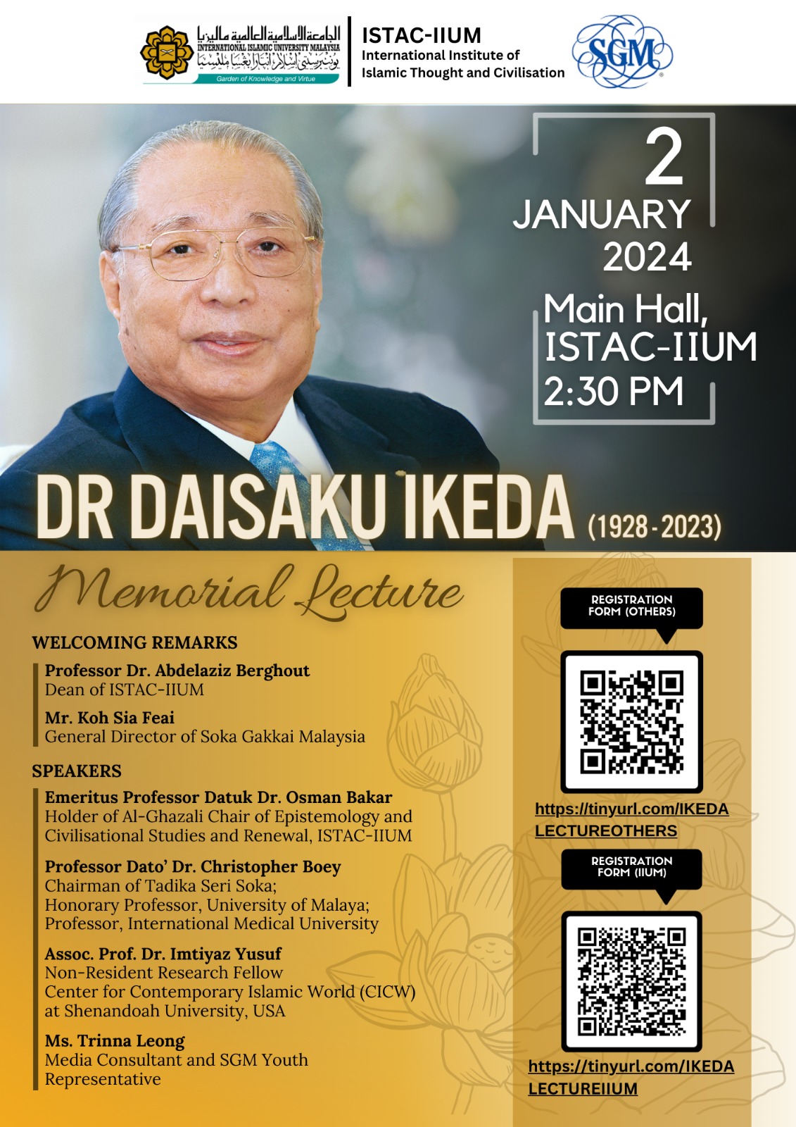 Upon hearing about President Ikeda’s passing, the International Institute of Islamic Thought and Civilization (ISTAC) of the International Islamic University Malaysia (IIUM) decided to hold a memorial lecture to commemorate President Ikeda’s contribution to peace and harmonious coexistence in the world as well as his tireless effort in encouraging and giving hope to people no matter who they are.
