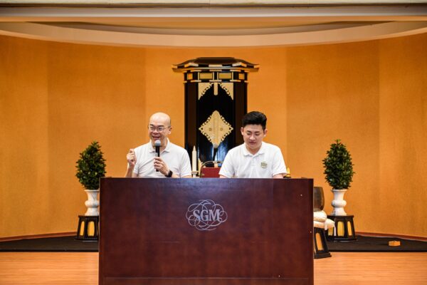 Participants also engaged in various activities with 40 high school division members. Together, they chanted daimoku, watched a video of President Ikeda, sang “Torchbearers of Justice,” and engaged in a home visit roleplay and dialogue session. The PICs also hand-crafted encouragement cards to give to the Junior Division members. The day concluded with a study session led by SGM study department leader Chia Kok Peng and future division leader Nelson Tan Zhi Ying.