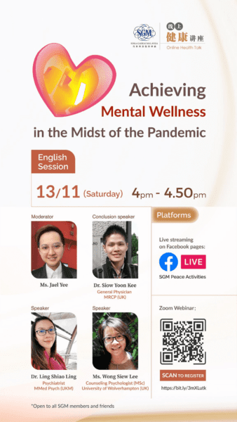 SGM would like to cordially invite you to join the online health talk, titled “Achieving mental wellness in the midst of the pandemic” on November 13 (Saturday). The talk will be conducted in Mandarin and English sessions, as follows: