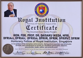 The Royal Institution, Singapore (RI) conferred upon SGI President Ikeda its highest honour of Honorary Fellow for his longstanding contributions to global peace-building and philanthropic contributions to humanity via peace, culture and education. In addition, RI also conferred upon President Ikeda the title of Doctor Fellow. The Institution’s Chancellor, FDr Dr Samuel M. Salvador, HFRI, DFRIProf, DFRIM, awarded the honorary fellowship to President Ikeda in a ceremony held at the SGI Asia Culture and Education Centre (SGI ACEC) on July 14. This conferment was part of the Institution’s 10th Global Congress and Conferment Ceremony (GCCC) held at the SGI ACEC. SGM General Director Koh Sia Feai received the award on President Ikeda’s behalf.