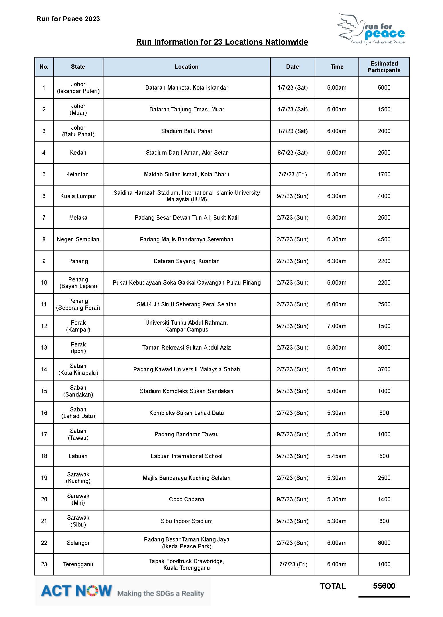 In line with SDG 17 – “Partnerships for the Goals,” SGM is collaborating with the Ministry of Youth and Sports, as well as local councils, institutions and organisations in various states in organising the run this year. In Klang Valley, the run will be held with joint efforts by the Klang Municipal Council and International Islamic University Malaysia (IIUM) at 2 locations— Padang Besar Taman Klang Jaya (Ikeda Peace Park) (July 2) and IIUM Gombak (July 9). The route distance is 8km and 3.5km respectively.