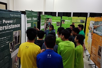 The exhibition was held in accordance with their Peace Week and was narrated by eight students from Hua Xia Private School. In total, some 100 people visited the exhibition.