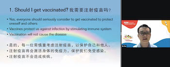 Following that, SGM Beacon Group member Dr Ho Kean Fatt proceeded to explain the use of vaccines, how they work to guard us against bacteria or viruses and the side effects that may occur. Dr Ho answered frequently asked questions on vaccination and stressed on the importance of getting vaccinated so that we are protected against COVID-19. Ms Wong Kim Eng, a senior nurse, presented the talk in Cantonese.