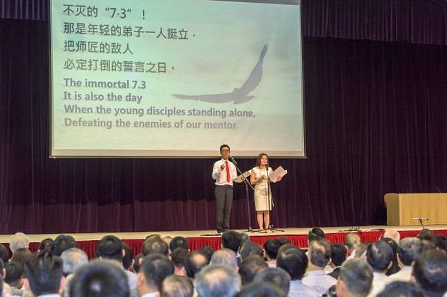 Student Division members Yap Chien Chin and Cheok Sin Nee recited a poem by SGI President Ikeda that spoke of July 3. In this poem, President Ikeda lauded the spirit of SGI members who advanced in accordance with the immortal spirit of mentor and disciple. SGM Selangor youth leaders Tan How Kian and Long Soi Lee shared experiences on advancing kosen-rufu in their state. How Kian spoke about overcoming family disharmony, financial difficulty and illness through striving in faith with his performance as Shin’ichi Yamamoto in SGM Selangor’s The Human Revolution Musical in 2010 as his prime point. Soi Lee spoke about how both of them worked to conduct happiness sharing meeting in their areas that created waves of expansion in SGM Selangor, and also inspired other states.