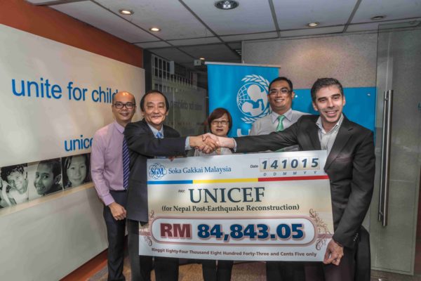 On 14 October 2015, Mr. Koh Sia Feai, General Director of SGM handed over the donation to The United Nations Children’s Fund – UNICEF, as a contribution to the reconstruction of the earthquake-stricken areas. The donation was received by Mr. Richard Beighton, Head of Fundraising and Partnerships of UNICEF Malaysia.