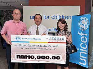 On behalf of SGM, Secretary-General Koh Sia Feai donated RM10,000 to the United Nations Children’s Fund (UNICEF) 2010 Haiti Earthquake Children’s Appeal on March 16, 2010. It was received by Mr. Cheah Yew Hee, Head of Operations, UNICEF.