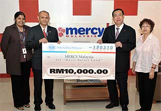 SGM also donated RM10,000 to the Malaysian Medical Relief Society (MERCY)’s Haiti Relief Fund. SGM General Director presented the cheque to Ir Hj Zairulshahfuddin Zainal Abidin, Executive Director of MERCY Malaysia on March 17, 2010. The funds collected will be used to support Mercy Malaysia’s partner, Medical Emergency Relief International (Merlin) in their emergency medical relief activities in Haiti.