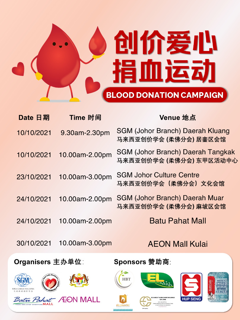 Soka Gakkai Malaysia (SGM) Johor Branch will organise a blood donation campaign to support and raise the blood reserve for the blood bank of the hospital.