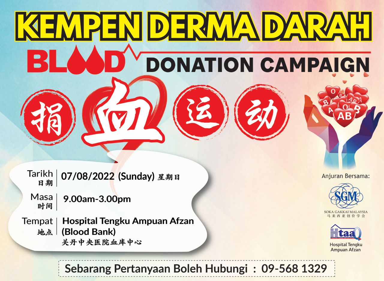 Soka Gakkai Malaysia (SGM) Pahang will organise blood donation drives together with Hospital Tengku Ampuan Afzan to support and raise the blood reserve for the blood bank of the hospital.