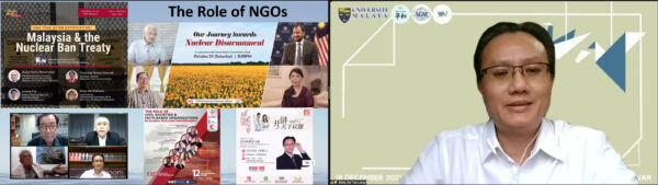 On 18 December 2021, University of Malaya (UM) organised an online international webinar and invited SGM Secretary-General Tan Leng to speak on the role of civil society organisations in supporting nuclear weapons disarmament.
