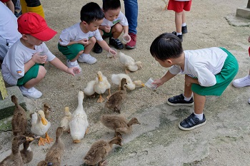 The tour programme included discovering various types of chicken from different countries; feeding animals such as ducks, ponies, cows, rabbits, sheep and goats; helping farm workers collect eggs from chicken coops; planting corn seedlings and catching fish with a small net.