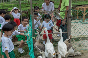 Upon arriving, they were welcomed by the manager of the farm. At first, they petted the rabbits and fed them prepared vegetable. They also fed the chickens and geese. Some of the children were initially afraid of approaching the animals, but were able to overcome their fear and involved themselves in the activities.