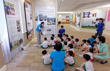 Under the guide of TSS teachers, the children first visited the “Our Beautiful Earth Photography Exhibition by Daisaku Ikeda” on the eighth floor to view photographs taken by SGI President Ikeda. The teachers used three languages – English, Mandarin and Malay – to narrate the stories behind the photos, which included famous landmarks such as the Niagara Falls, the Leaning Tower of Pisa, Mt Fuji and the Himalayas. They learnt about importance values such as the spirit of never-giving-up in the face of obstacles. The teachers also told stories the children had previously heard in class to enable them to understand the messages behind the photos more easily.