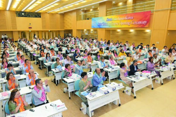 联合研修会开幕典礼。(8月14日,韩国首尔纪念讲堂)来自各国的研修会参加者累计的移动距离,足以绕地球九圈。同志的求道心,如地球般广阔。