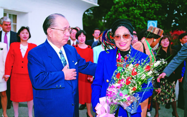 池田先生在美国创价大学洛杉矶分校迎接罗莎·帕克斯。她聆听青年合唱 《We Shall Overcome》,面露微笑。(1993 年 1 月 30 日)
