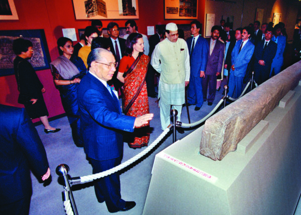 东京富士美术馆举办的“阿育王、甘地、尼赫鲁”展。池田先生(前排左1)与索尼娅·甘地印度前总理夫人(前排左2)等人一同欣赏阿育大王的相关文物。(1994年10月)