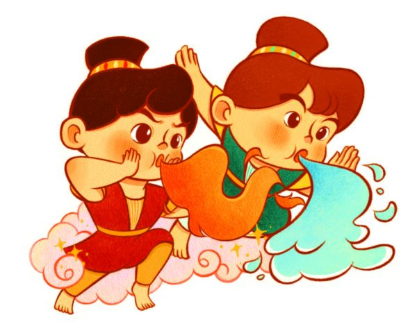 第二天,他们突然出现在国王面前,“砰”的一声飞上了天空!国王惊呆了。只见两个王子在空中喷水、喷火,还能变大变小,一会儿不见了,又突然出现,像在变魔术一样!
