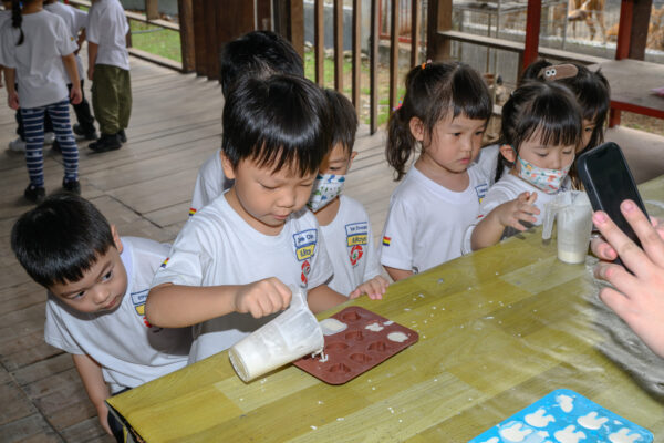 在体验环节中,园生们还亲手将新鲜牛奶倒入模型,学习制作肥皂的过程,感受从动物资源到日常用品的转化,寓教于乐。