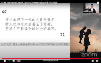 为回应池田先生“只要青年集思广益,就能打破世界僵局”的呼吁,2020年9月5日,SGM举行线上“全国青年和平大会”,播放量达5785人次。