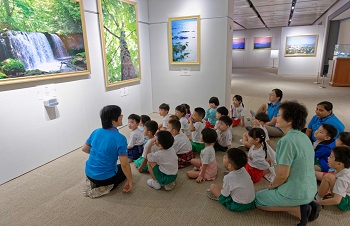 园生在老师的引导下参观“美哉地球——池田大作摄影展”。尼加拉瓜瀑布、比萨斜塔、富士山、喜马拉雅山等大自然壮丽的美景映入园生眼帘,老师分别以马来语、英语和华语讲述照片背后的故事。园生从故事中学习到面对困难时,不放弃等重要价值。