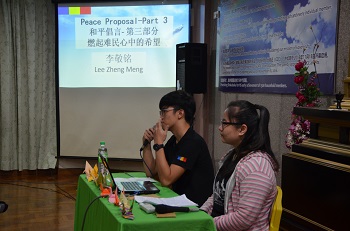 森分会则于16日由学生部举办第七回《和平倡言》分享会,约一百一十人出席。在梁玮君的钢琴独奏后,代表分享倡言内容。最后,全体合唱森州学生部创作的《自觉和平的信念》结束分享会。