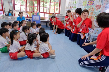 18位创大生一行人受到创幼校长黎来好与教职员的热情迎迓,包括现场的175位创幼生。胸怀两校创办人池田大作先生的心意,创大生与小弟妹们共舞,也到各班与他们互动。