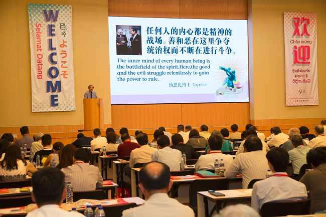 SGM理事长许锡辉发表主题演讲时,为如何超越人生与广佈大难做了两个结论:我们有伟大无比的大圣人佛法,以及传授“绝对胜利的信心”的师匠。而师匠传授我们的两点是,要毕生走上师弟不二之道,及秉持不惜身命、死身弘法的精神。许理事长最后再次呼吁与会者,要不断加强师弟纽带、巩固自身的信心。