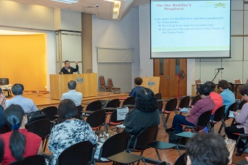 | 吕耀年男子部长讲解《显佛未来记》 | 彭作威副理事长讲解《显佛未来记》 |