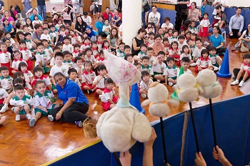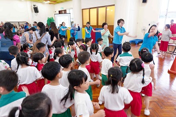 园生与教师一同高唱国歌及园歌、跳起“Hello Hello”与“Magic of Alala”的早操,开心地与周围的人打招呼,打成一片。
