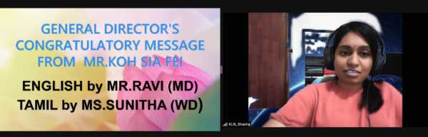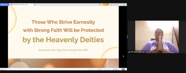 会上宣读SGM理事长许锡辉的贺辞。许理事长勉励面对艰难疫情仍然献身广布的会员,务必以池田先生教导的不屈精神面向挑战。他也呼吁全员于2022年培育与折伏青年,携手达成“青年学会”的目标。