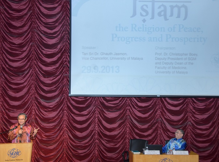 马来亚大学副校长丹斯里高斯•贾斯蒙博士于2013年9月29日莅临SGM综合文化中心为《生生不息为和平》马来文版主持推介礼,并于尔后以“伊斯兰教:一个和平、进步与繁荣的宗教”为题向约二百五十位听众发表演讲。