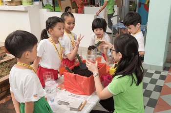 翌日,孩子们把所学的“环保”理念付诸行动,亲手栽种洋葱、制作果皮酵素及设计手绘T恤。孩子们皆踊跃分享如何爱护地球,如:使用环保袋和便当盒、与朋友共车及节省资源等。每个人都决意成为保护地球的小勇士,坐言起行实践“保护地球,由我做起”。