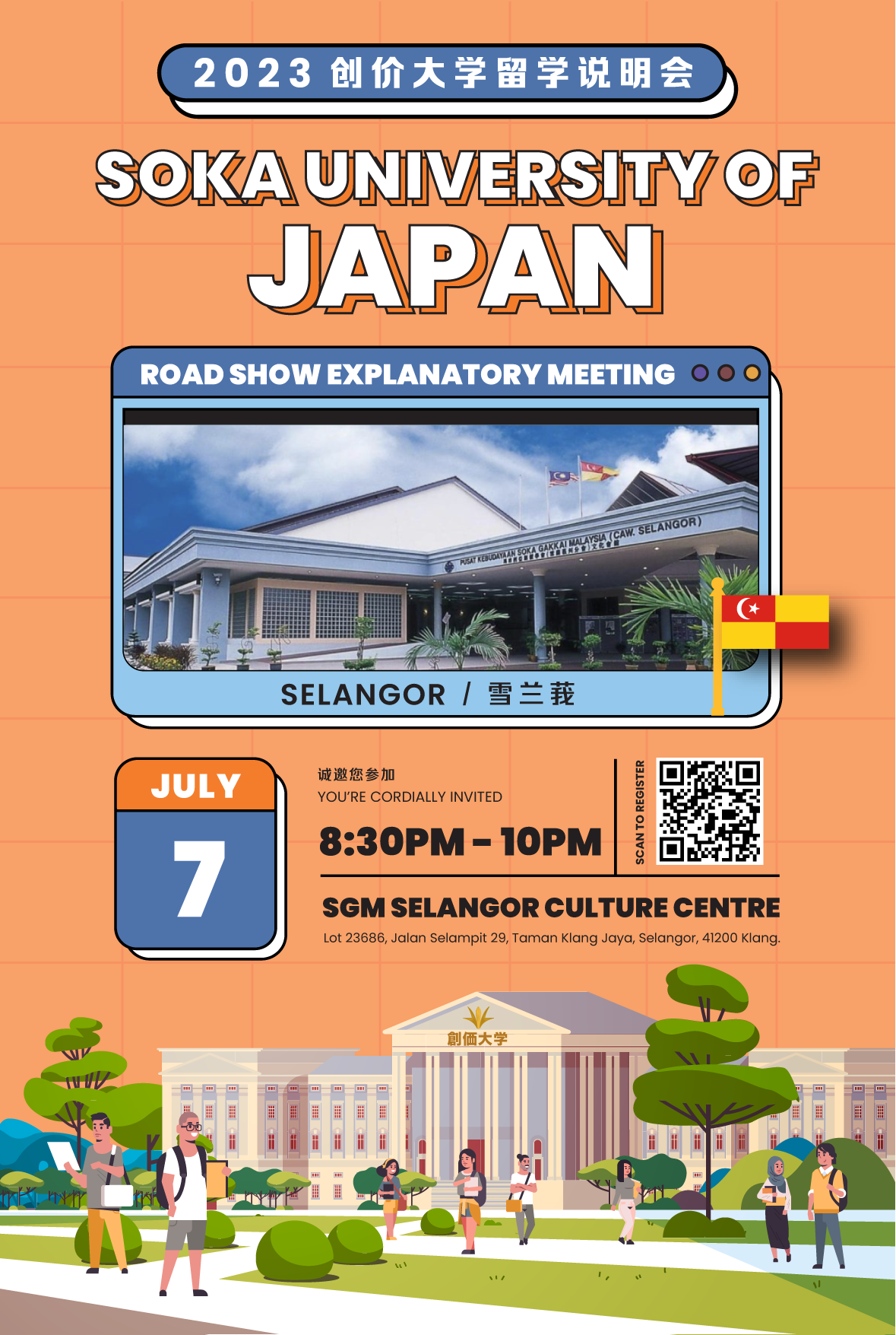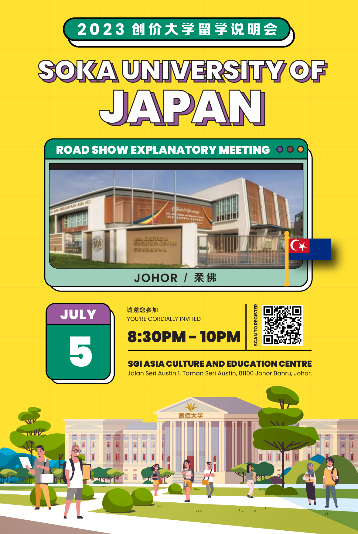 日本创价大学(日本创大)代表将莅临马来西亚举办“留学说明会”。届时,创大代表将巡回槟城、柔佛、吉隆坡和雪兰莪四州举办说明会。四场说明会的内容皆为一样,并且会后将有一个小组环节,让参加者进行咨询。