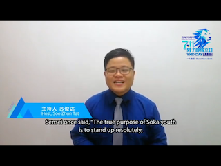 陈俊光男子部长介绍成立日的意义,也与部员学习“一人奋起”的精神。他以池田先生为例,敦促部员鼓起勇气,突破障壁,主动致力扩大对话,共同建立永不崩溃的折伏文化。