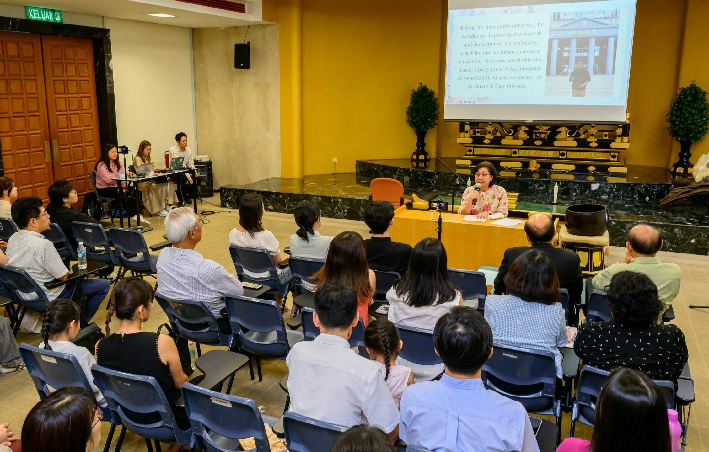 随后,三位校友杉本英子、胡俊文和陈文钊分享体验,并观看创校50周年纪念录像。马来西亚创友会负责人郑丽玲在致辞中表示,受益于创办人的无数鼓励,今后将弘扬其伟大精神,培育更多接班人,展现胜利的成果。
