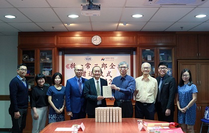赠书仪式在新纪元大学学院进行,该校校长莫顺宗博士从SGM理事长许锡辉手中接领赠书。