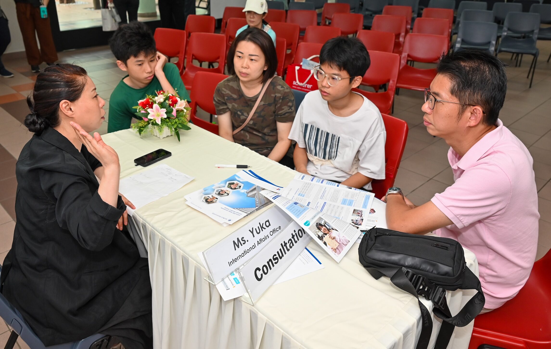 之后,杉本教授介绍FILA、理工学院的户田龙树教授,由教授介绍明年开设的新科系——绿色科技,讲解其发展与多元应用。国际事务处的植田由香与叶梓轩则介绍大学课程、入学流程、奖学金、就业支援及学生生活等。